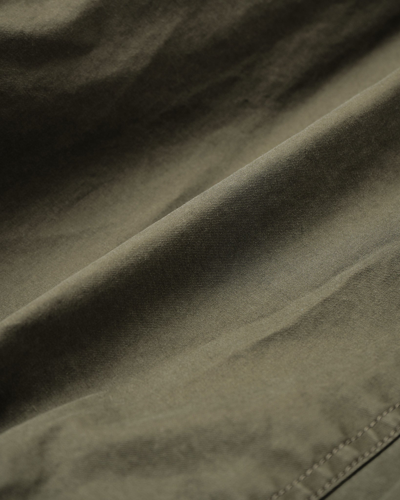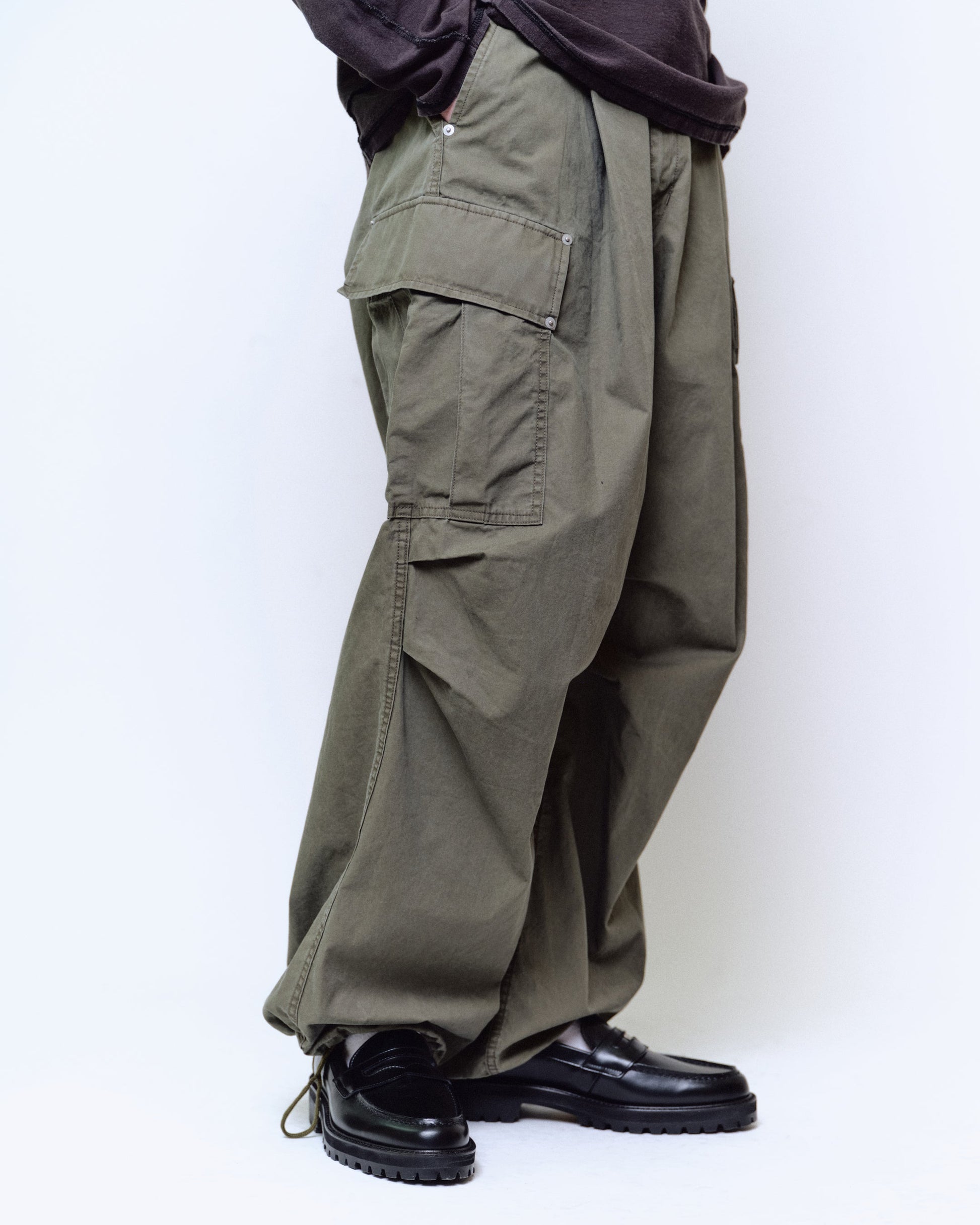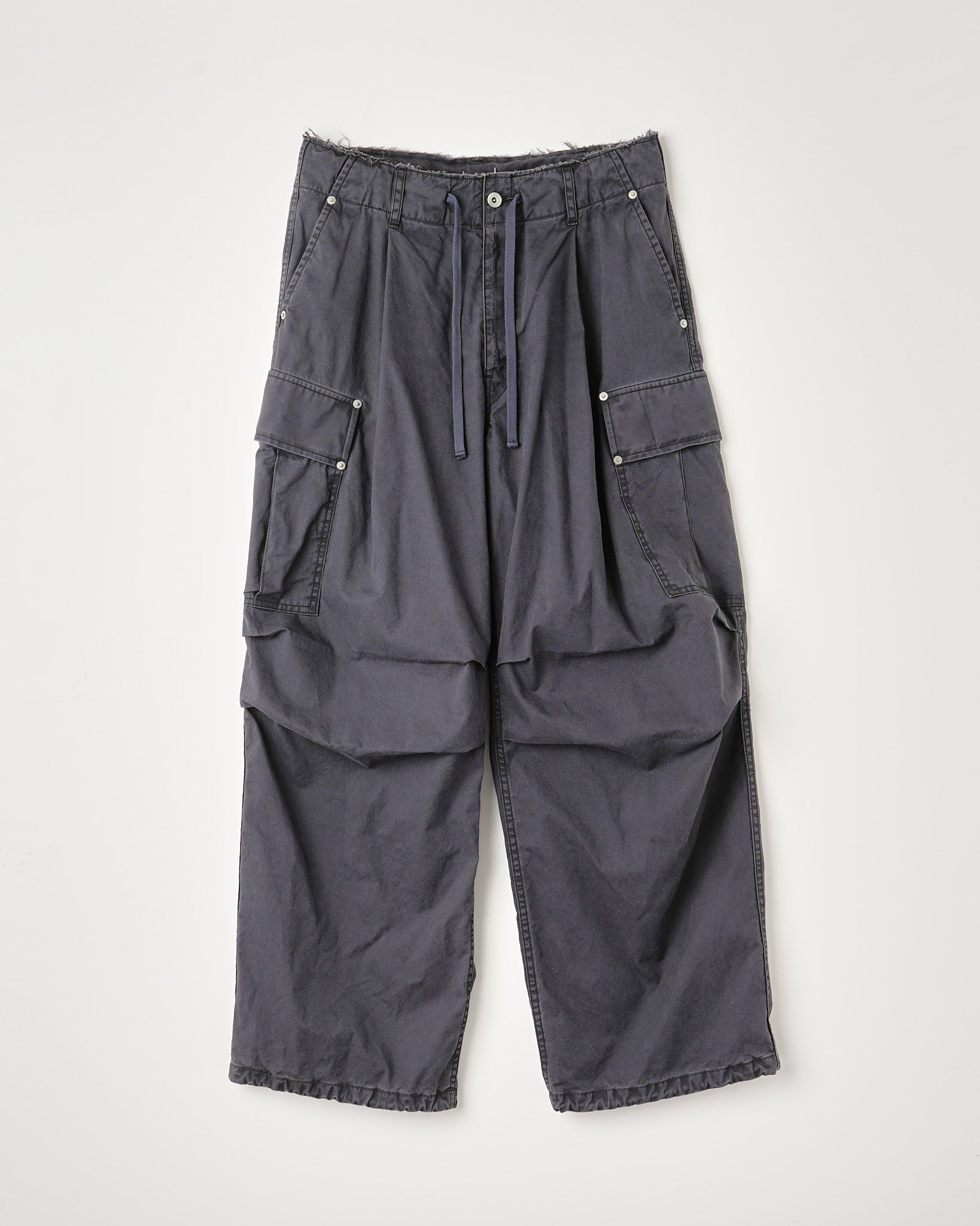 大ぶりなポケットを配置したカーゴパンツ。 リベットやネオバボタンを使用。ナローなラインのJステッチ。 ミルスペックのアジャスター。ワンタックワイドシルエット。 微起毛の高密度サージ素材。バイオ加工による経年変化した仕上げ。