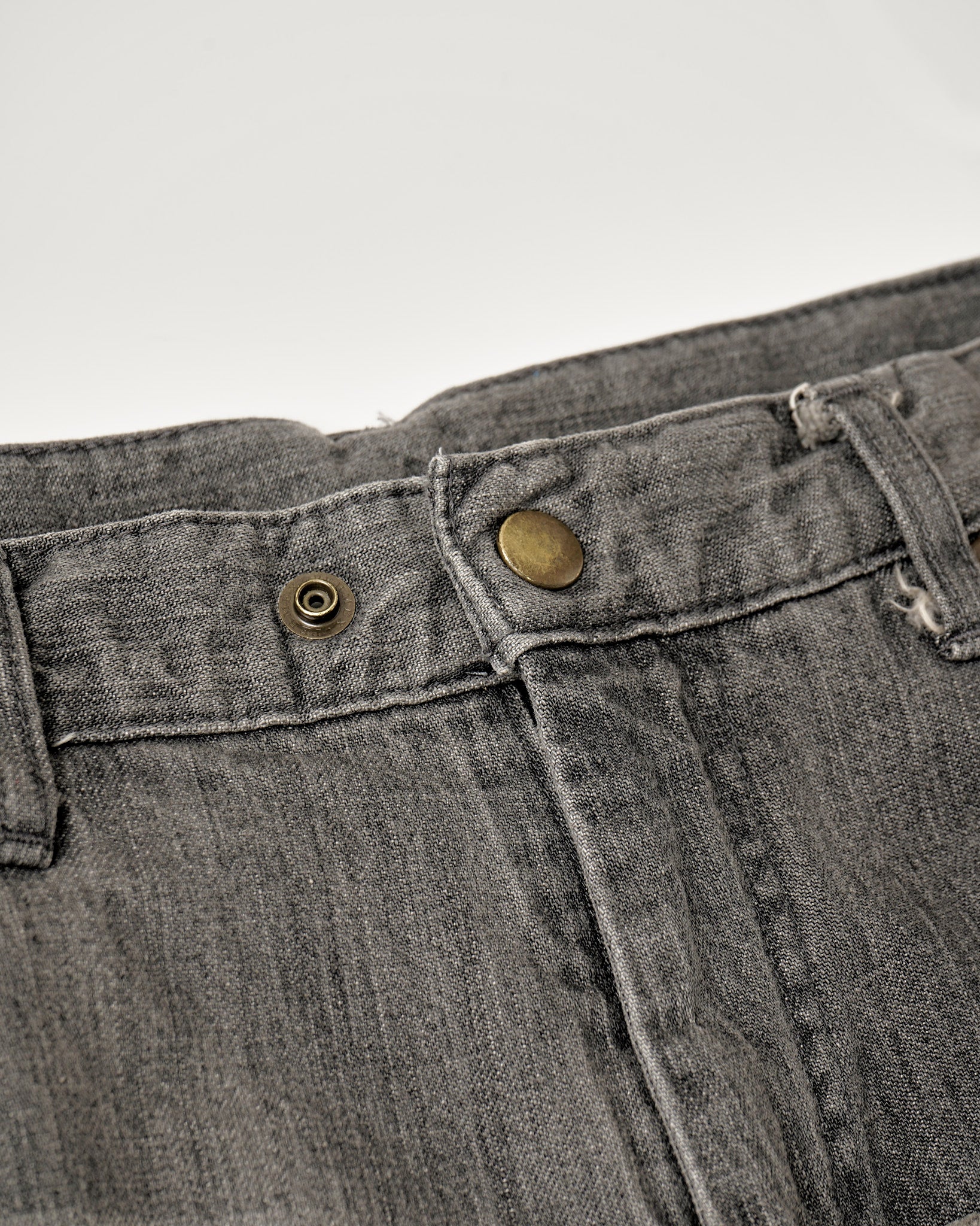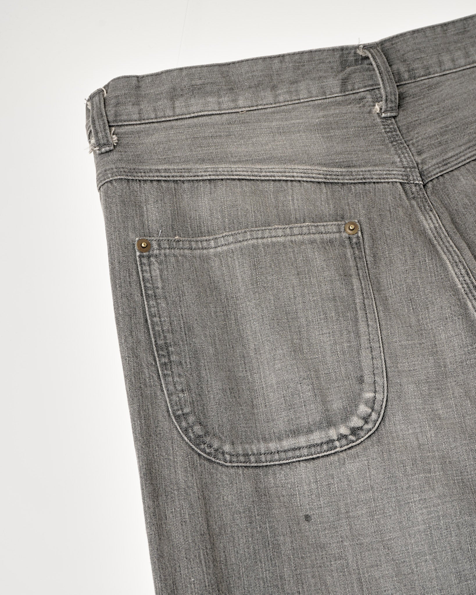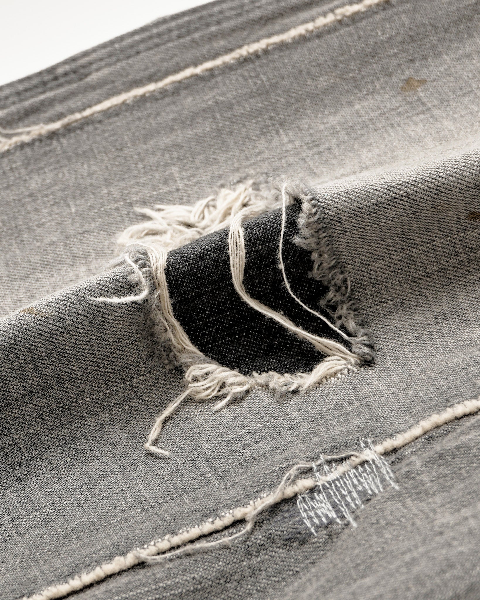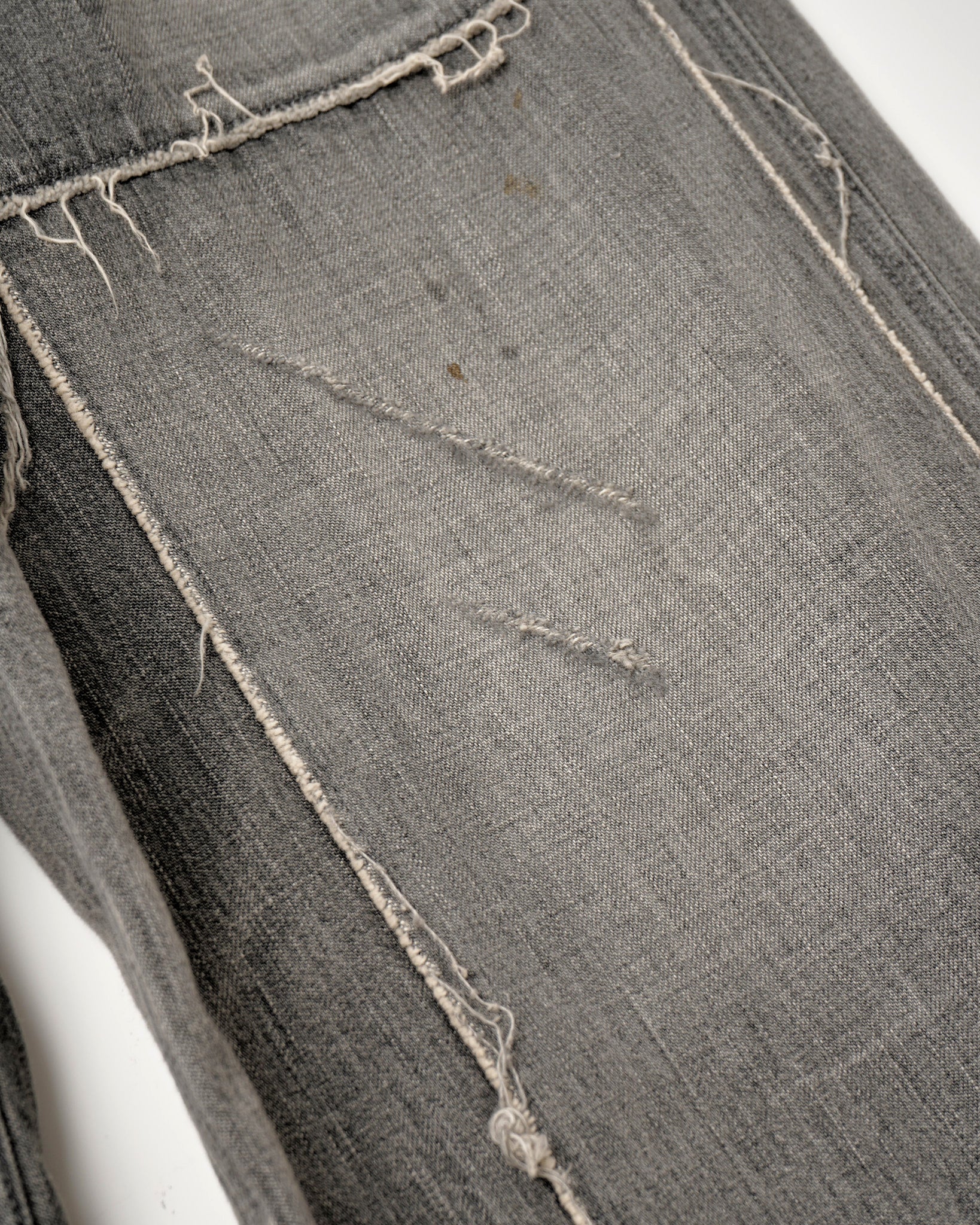 リペアを重ねたデニムをイメージして製作ペインターパンツ。ダブルニー風のリペア。左右非対称のバックポケット。ストレートシルエット。11ozムラ糸デニムを使用。