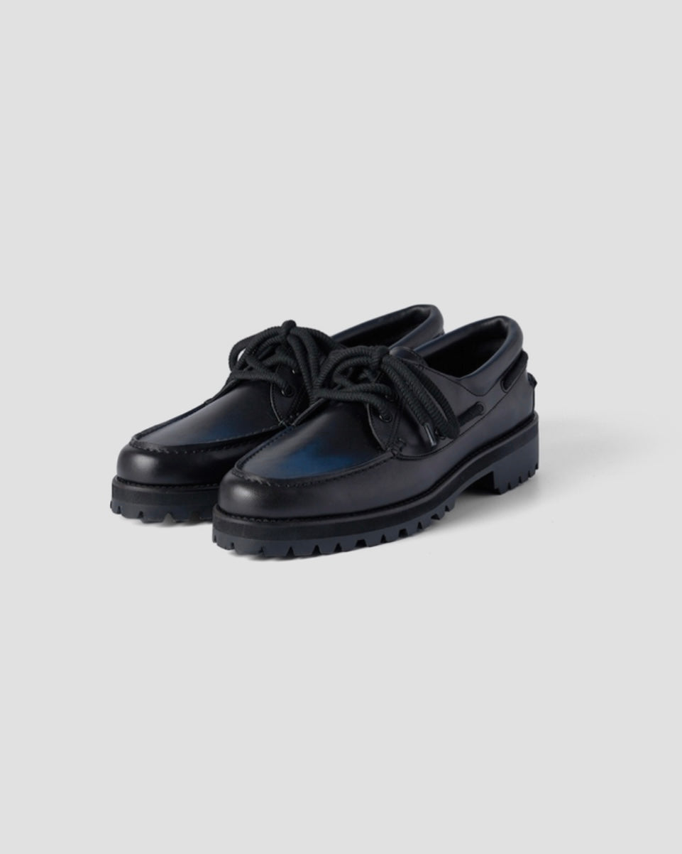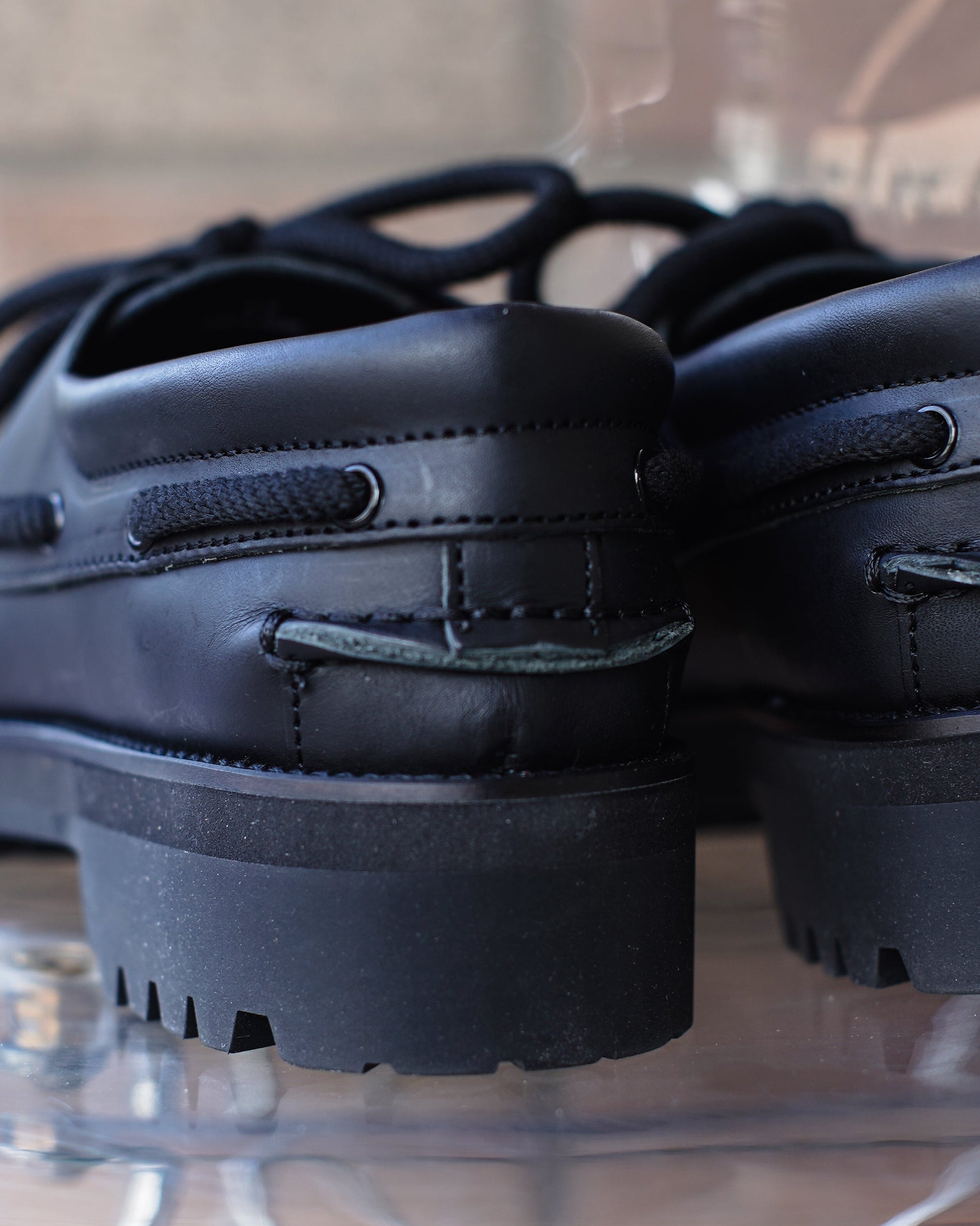 ミモザ・ケプラのタンニンをじっくり染み込ませた100%植物タンニンなめしの厚手の革にVibramソールを使用し、紐にはFAT LACEを採用し、ボリューム感のあるデッキシューズ。