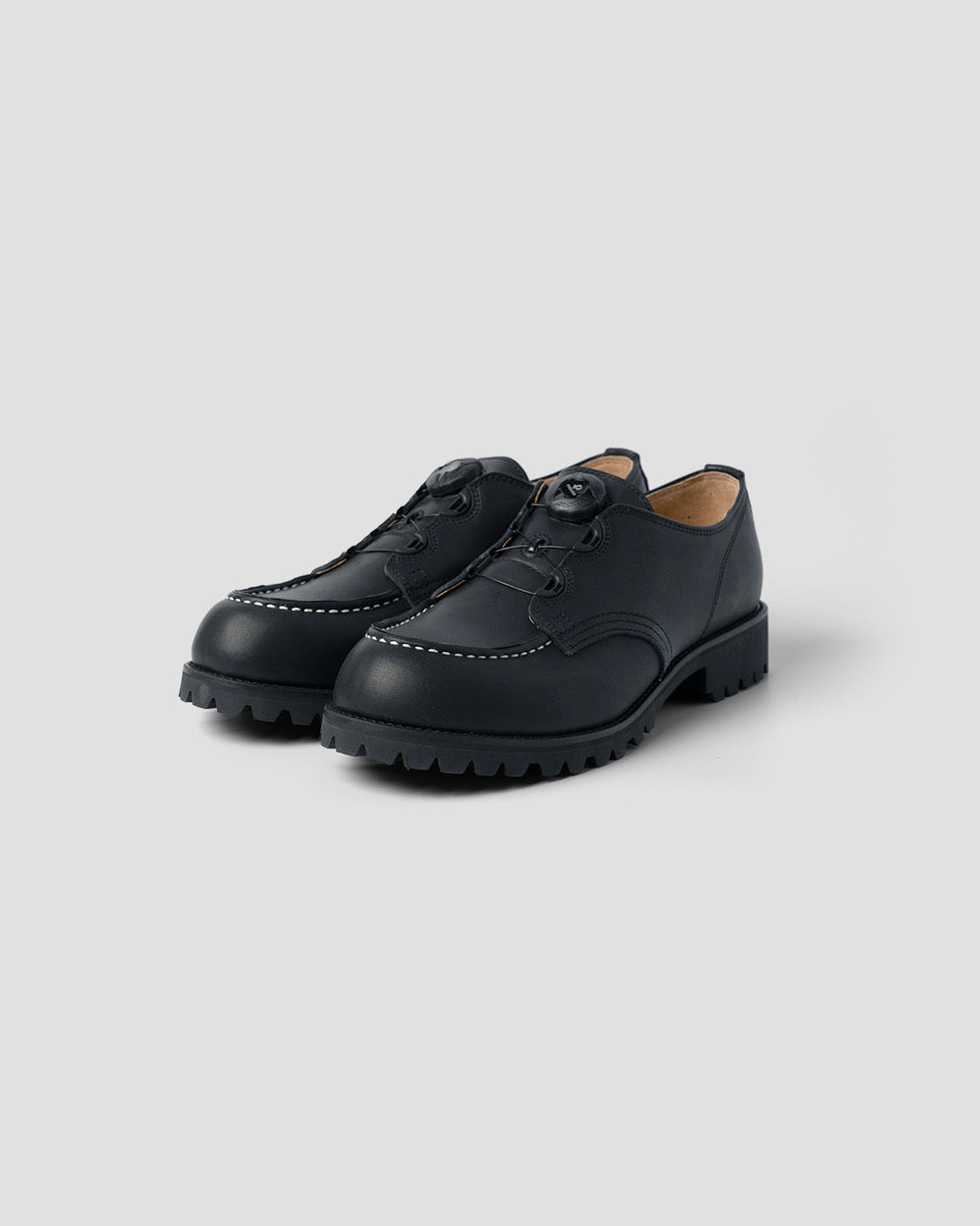 鉛・フタル酸不使用、染色段階でタンニンを多分に含ませ程よいコシのあるレザーを使用し、ワークブーツモチーフではあるがシューレースではなく、フリーロックシステムを採用したTomo&Coのシューズ。
