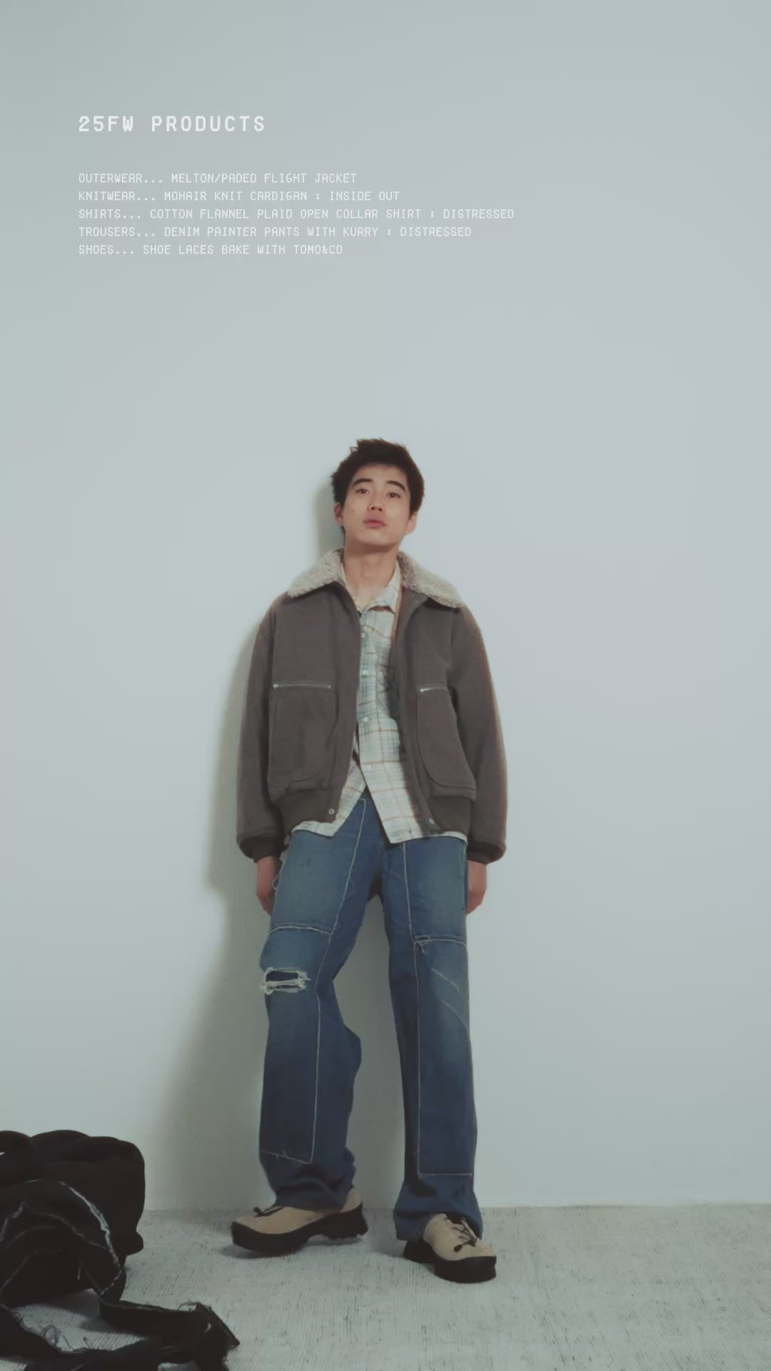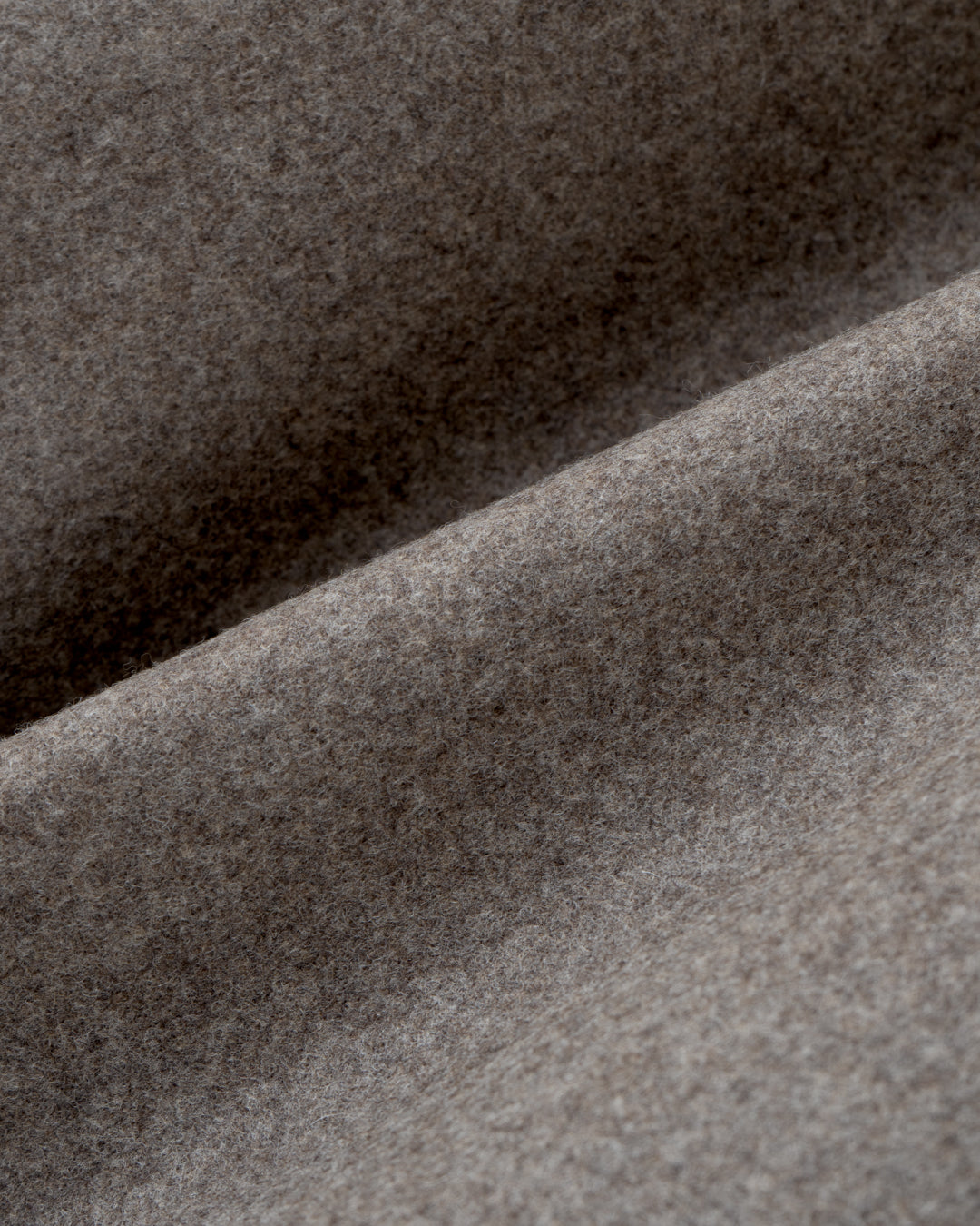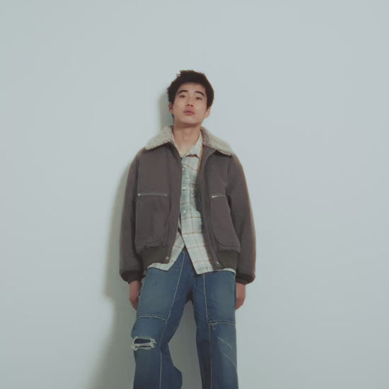 中綿入りのウールメルトンを使用したフライトジャケット。 ジップ+玉縁のダブルのラウンドポケット。 Super100'sを使用した自然な光沢感をもつ素材。