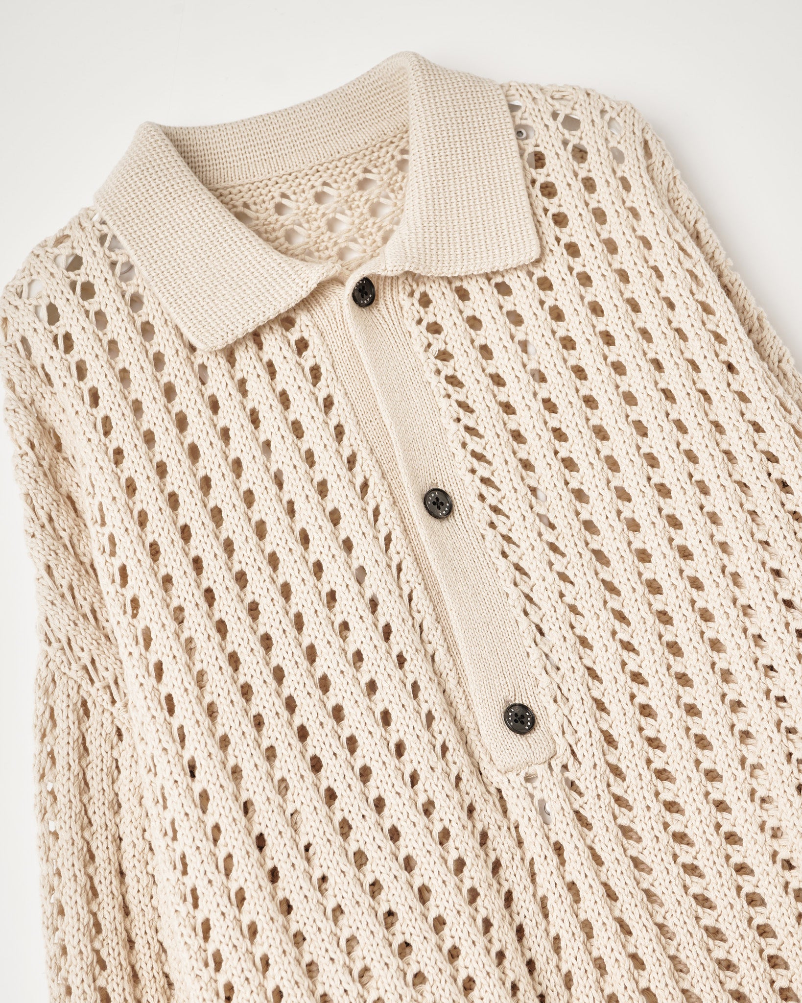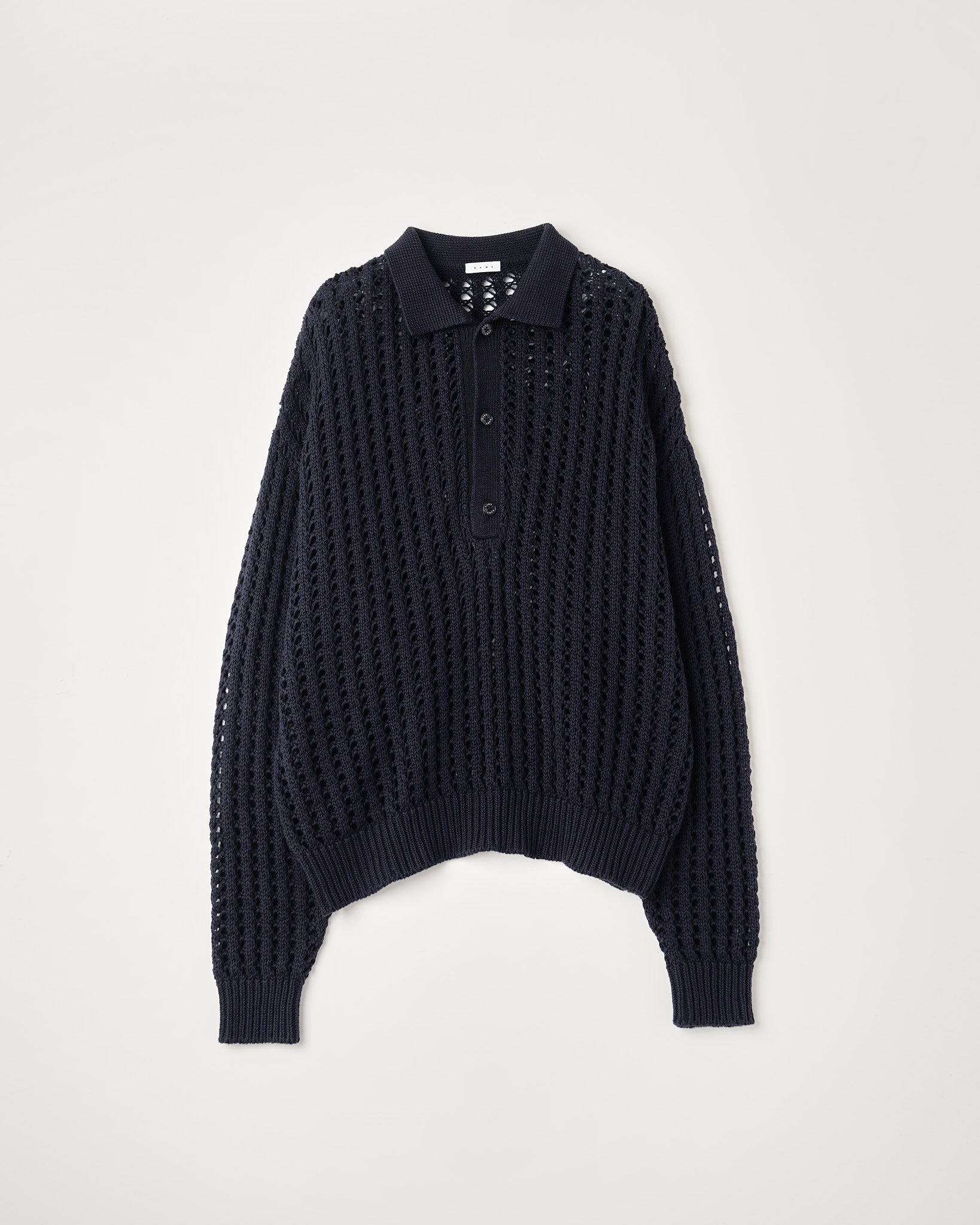 深めの開きを設けたプルオーバーメッシュニット。ヴァルーズライクな深めの開き。ルーズサイズシルエット。コットン100%のラダーメッシュの飾り編み。