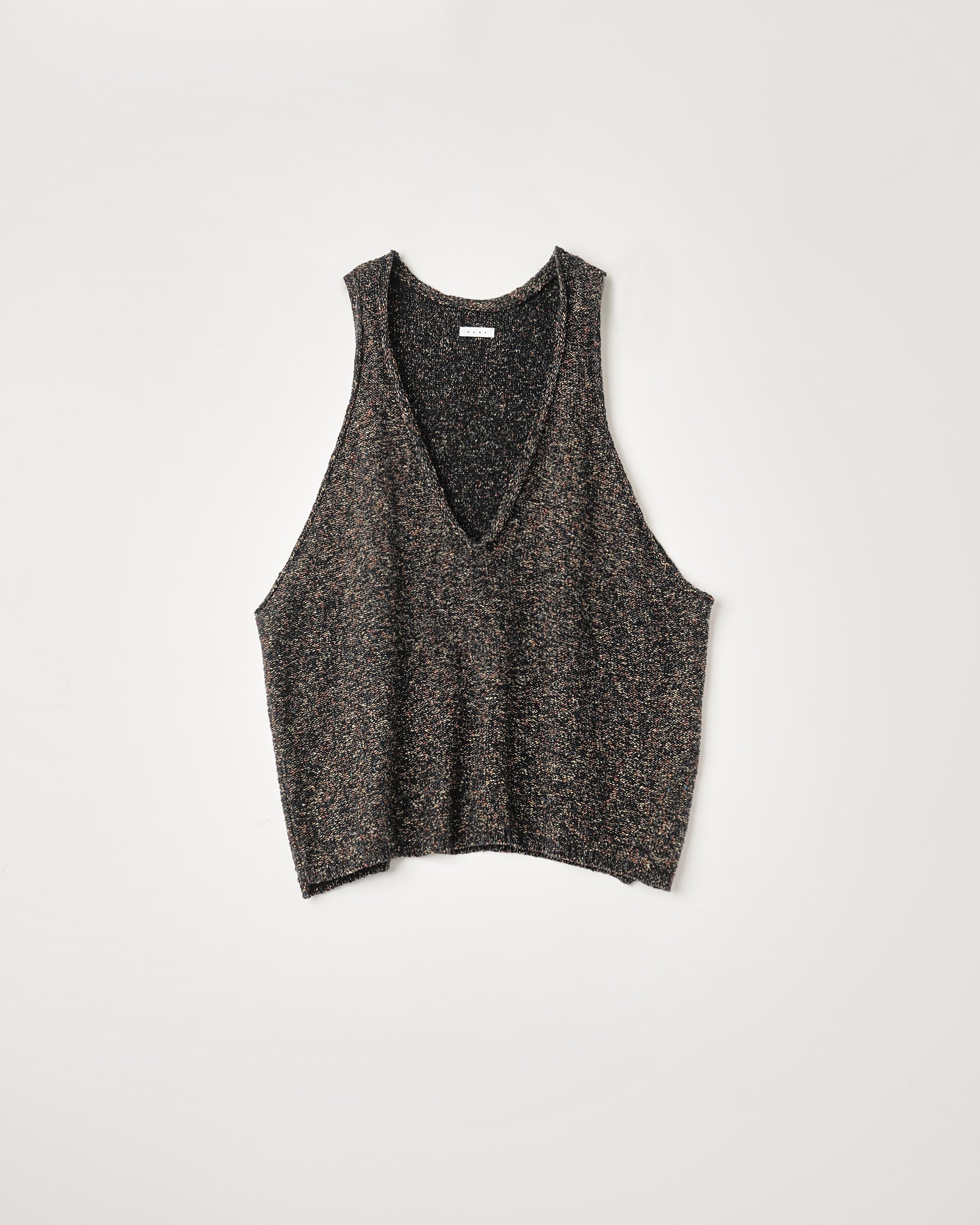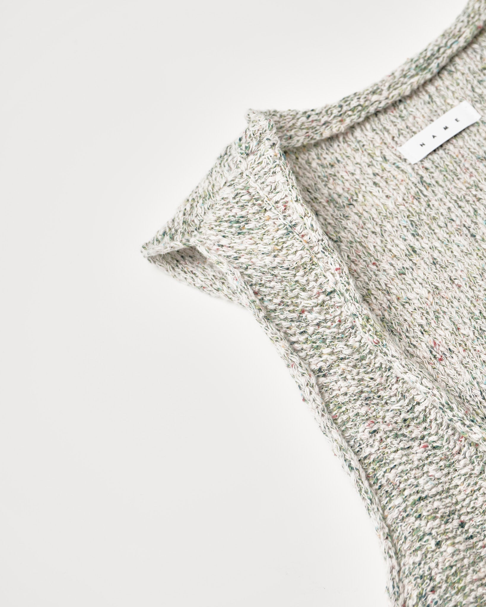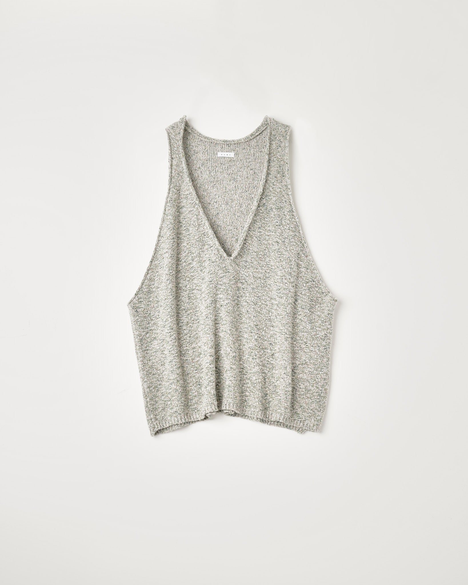 肩、脇の縫い目をずらしたVネックのニットベスト。深めのVネックとアームホール。ロールさせた首周りとアームホール。インサイドアウトさせたメランジ天竺編みのニット。糸は綿リネンのメランジ糸を使用。