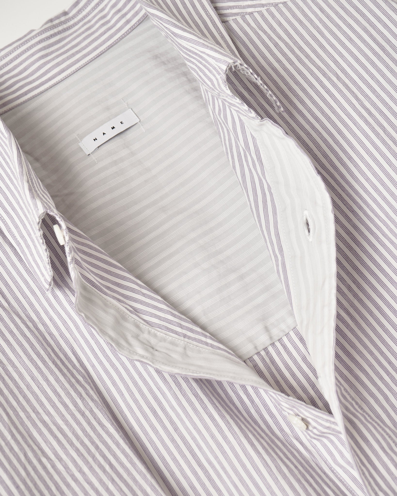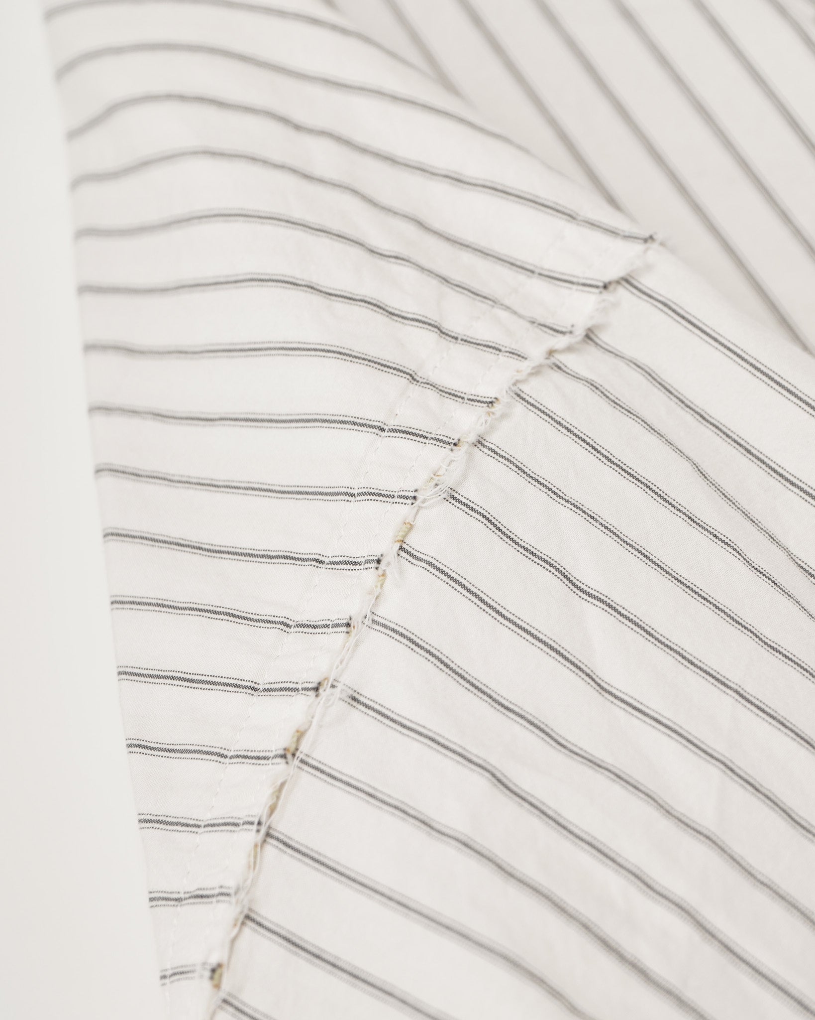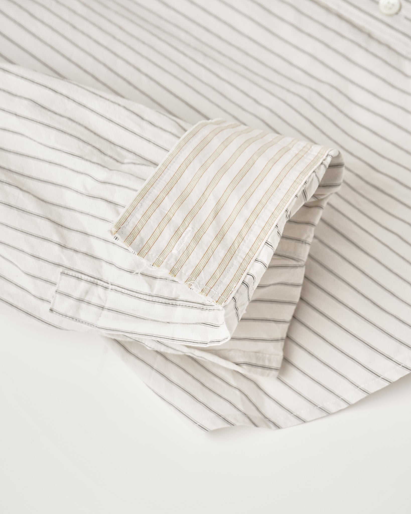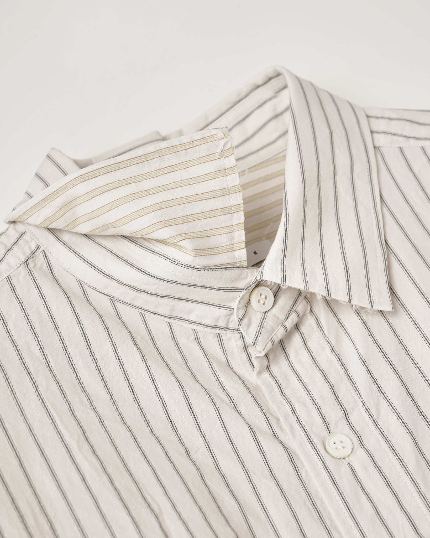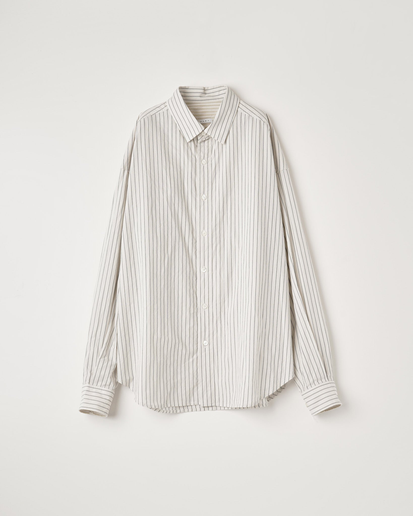 レギュラー型のストライプシャツ。縦長のルーズフィットシルエット。襟裏、カフス裏、前立裏、ヨーク裏に柄違いのストライプを切り替え。裾、袖先、襟周り、アームホールはカットオフ。素材はダブルワッシャー加工をかけたタイプライターストライプ。ワッシャー加工によるシボ感が特徴。