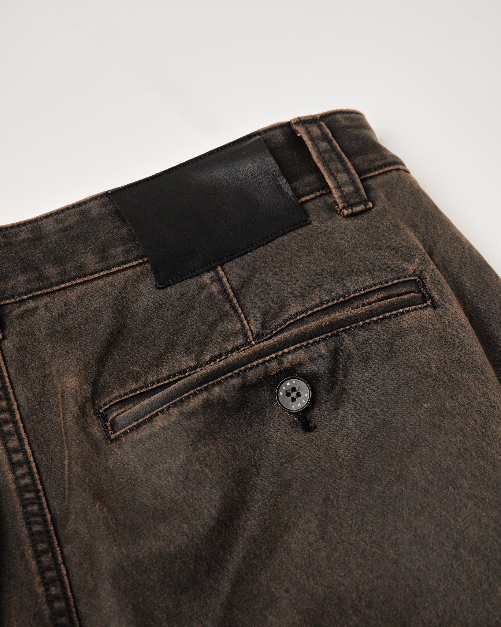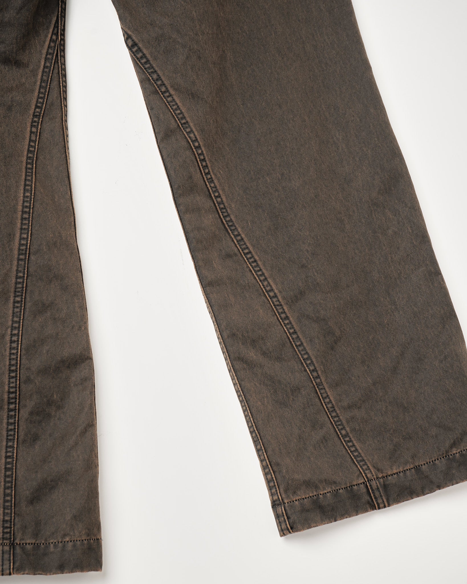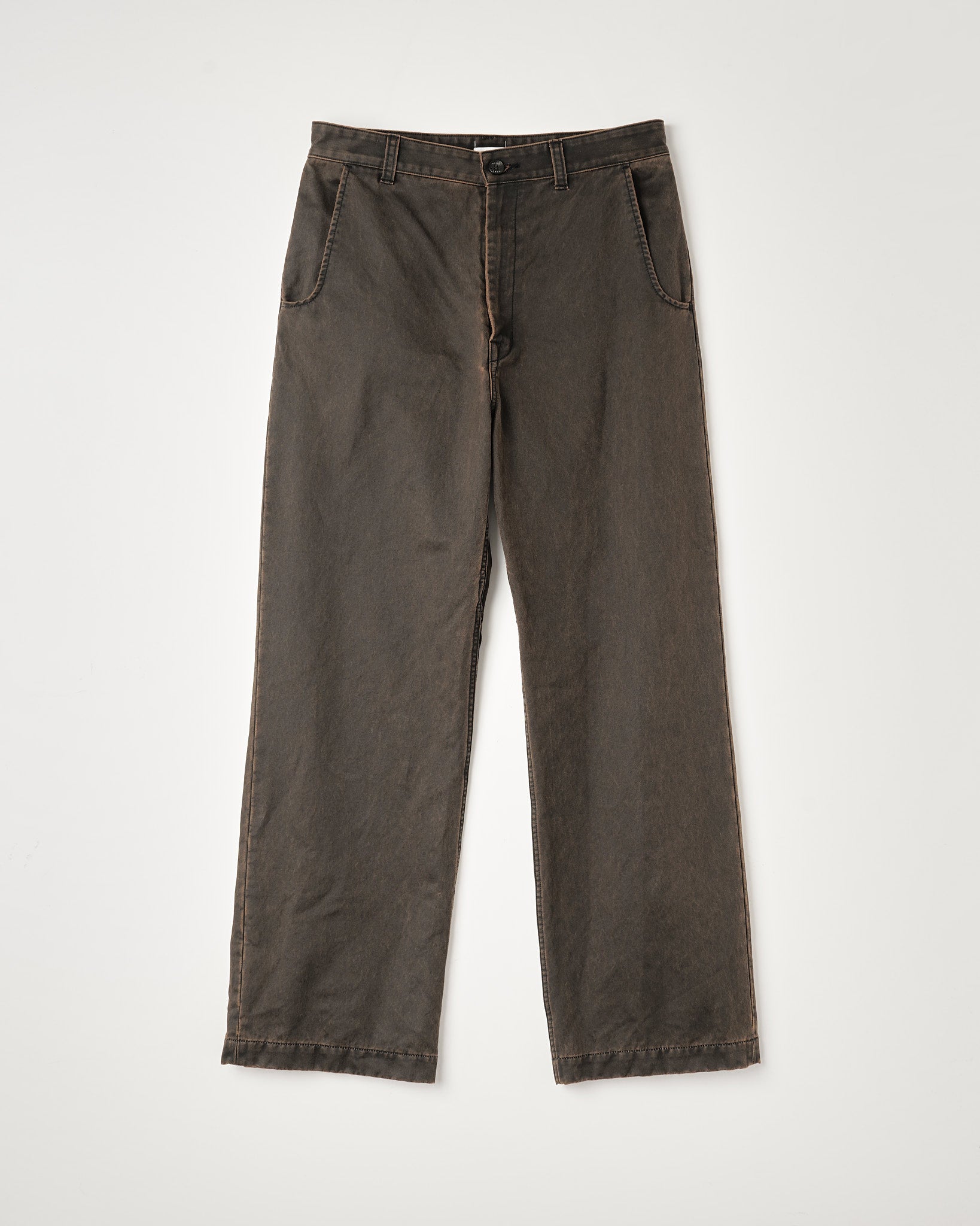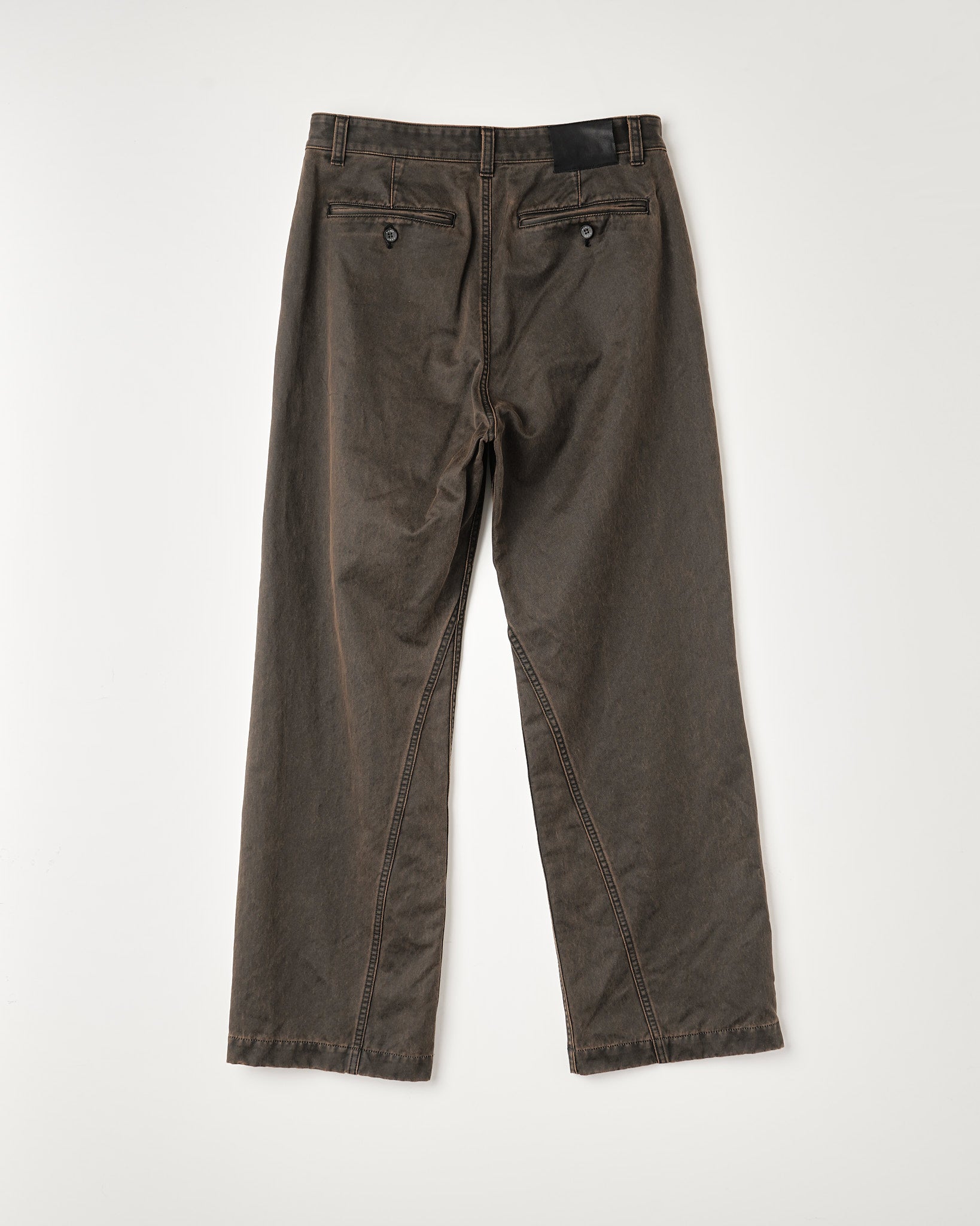 ストレートシルエットのコットンパンツ。 三角形の切り替えを配置した前後でシルエットの見え方が変わる構造。 深めのUポケット。幅の太いベルトループ。 顔料コーティングを施したキャンバス素材。 製品バイオを加える事で顔料が剥がし、着用に伴い経年変化する仕上げ。
